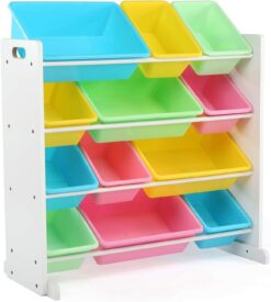 This space-saving Tot Tutors Kids Toy Storage Organizer with 12 Plastic Bins stores lots of children’s toys in easy-to-see, easy-to-access plastic bins. The 8 standard and 4 large easy access storage containers are removable, making it fun for kids to take out toys, books, and games for playtime and quick to clean up after. This toy storage box alternative helps keep your little one’s room clean while at the same time the bins can teach color identification as well as sorting and cognitive skills.
