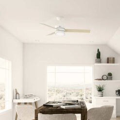 The Exeter is a play on geometric shapes, with rectilinear blades embedded in the round housing. This contemporary ceiling fan’s simple and modern form complements clean, modern interior design spaces. Reversible blades in cool-toned finishes coupled with a Fresh White housing to complement other hardware finishes throughout the home make this fan an inviting addition to modern, large living spaces. The Exeter includes dimmable, energy-efficient LED bulbs that are easily adjusted using the handheld remote control.