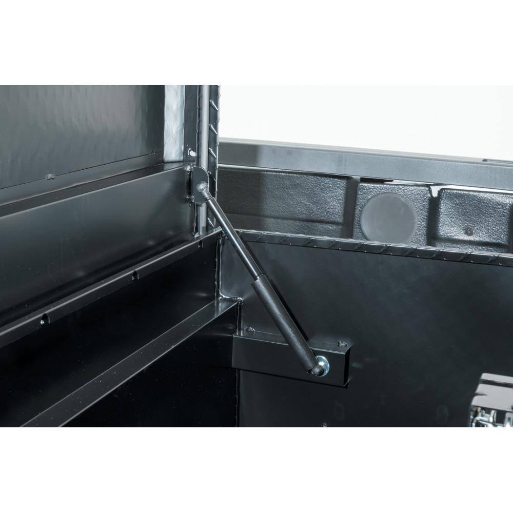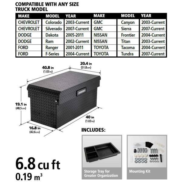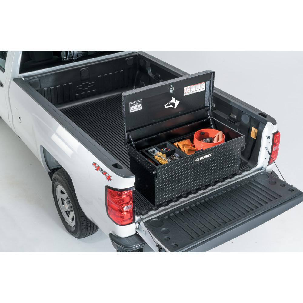 The Husky Aluminum Chest Box for full size and compact trucks provides protection for your tools and equipment from the elements and break-ins. The chest box is the perfect companion for the Husky Aluminum Saddle Box when more protected storage is needed. The fully-welded aluminum construction and rubber weather seal protect your items from inclement weather. It is powder coated black inside and out for protection against oxidation. The easy-to-use, lockable push button and fully welded loop striker help resist break-ins. Included with the box is a sliding plastic tray that allows you to organize and easily access your small tools and hardware. Included as well is the mounting kit that mounts to the truck bed floor.