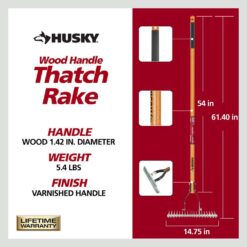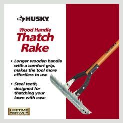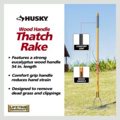 Transform your lawn care routine and uncover the lush, green oasis that awaits with The Husky 54 in. Long Wood Handle 19-Tine Thatch Rake with Cushion Grip, the perfect solution to help you maintain a lush, healthy yard with ease. This all-purpose lawn rake is uniquely crafted to clear dead grass clippings and promote a thriving outdoor environment. This innovative rake features carefully engineered curved tines that are designed to sweep away dead grass clippings, ensuring that your lawn receives the essential sunlight, air, water, and fertilizers for optimal growth.This rake is ideal for preparing your lawn for fertilizing reseeding. Boost your lawn’s health and elevate your outdoor space with this powerful thatching rake, designed with your comfort and yard in mind. At Husky, we stand behind the quality and durability of our products, which is why we offer a manufacturer lifetime warranty.