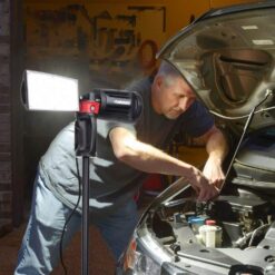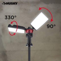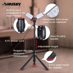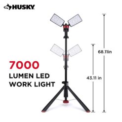 The Husky LED portable corded work light has the high output of 7000 Lumens. It is perfect for any home or job site project. With it’s heavy-duty professional grade die-cast aluminum housing, tri-pod stand and rotating heads it makes any job easier. When the job is finished, just fold up, wrap the cord up using the built-in cord wrap system and easily fold up.