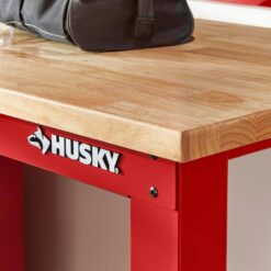 Organize your garage with this Husky solid wood top workbench. With a holding capacity of up to 3,000 lbs. and an adjustable height, you have plenty of room to work. The solid wood top provides durability and a flat work surface.