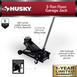 The Husky 3-Ton Garage Floor Jack can easily lift up to 6,000 lbs. at a maximum height of 21 in. The swivel casters are designed to position accurately under your vehicle. The detachable included handle allows for easy and convenient storage when this car jack is not in use. The 3-Ton Garage Jack uses hydraulic pressure to lift a vehicle off the ground and features a steel construction. The Husky 3-Ton Garage Jack offers easy positioning under cars, trucks, and SUVs. This car jack is the perfect car accessory to add to your Husky automotive and tool collection.