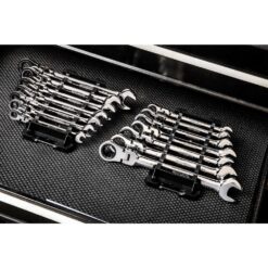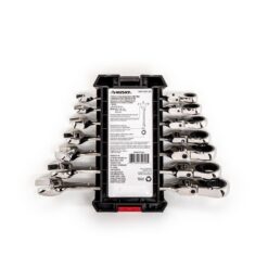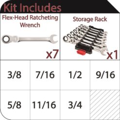 - 7-piece set includes flex-head ratcheting wrenches covering sizes 3/8″, 7/16″, 1/2″, 9/16″, 5/8″, 11/16″, and 3/4″
