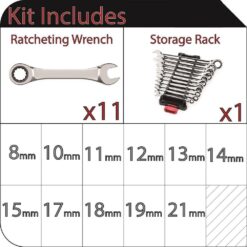- 11-piece set includes ratcheting wrenches covering sizes 8mm, 10mm, 11mm, 12mm, 13mm, 14mm, 15mm, 17mm, 18mm, 19mm, and 21mm