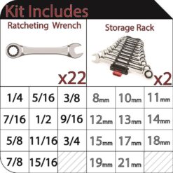 - 22-piece set includes SAE sizes 1/4 in., 5/16 in., 3/8 in., 7/16 in., 1/2 in., 9/16 in., 5/8 in., 11/16 in., 3/4 in., 7/8 in., and 15/16 in., and metric sizes 8mm, 10mm, 11mm, 12mm, 13mm, 14mm, 15mm, 17mm, 18mm, 19mm, & 21mm