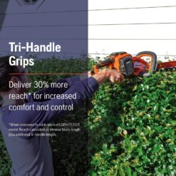- TRI-HANDLE GRIPS: Cordless hedge trimmer features tri-handle grips that provide 30 percent more reach with improved control and comfort versus other comparable hedge trimmers”