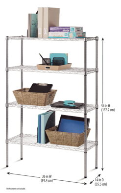 Hyper Tough 4 Tier Wire Shelf Unit is ideal for home and commercial use. It has strong and durable welded wire construction in chrome color. Open wire design allows air circulation and reduces dust build-up. It is NSF certified for dry environment storage. Easy assembly with no tools required. Shelves can be adjusted in 1 inch increments. Each shelf can hold up to 350 lbs evenly distributed. Includes adjustable foot leveler help ensure stability on uneven surfaces. This wire shelving system is perfect for homes, offices, warehouses, kitchens, restaurants and any other places you need to organize.