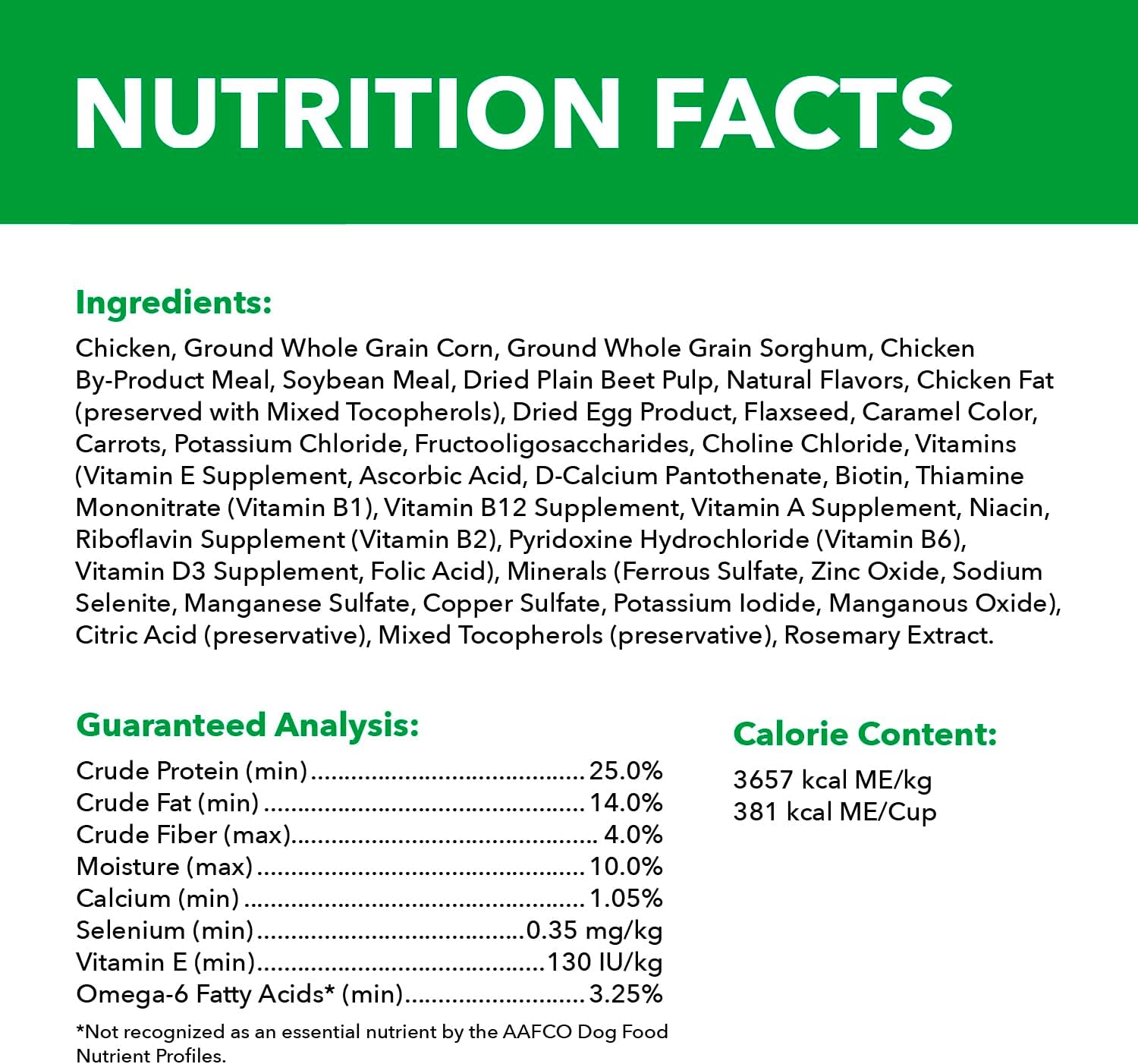 INGREDIENTS: Chicken, Ground Whole Grain Corn, Ground Whole Grain Sorghum, Chicken By-Product Meal, Dried Plain Beet Pulp, Natural Flavor, Flaxseed, Dried Egg Product, Chicken Fat (Preserved with Mixed Tocopherols), Caramel Color, Vitamins (Vitamin E Supplement, Ascorbic Acid, Calcium Pantothenate, Biotin, Thiamine Mononitrate (source of Vitamin B1), Vitamin B12 Supplement, Vitamin A Supplement, Niacin, Riboflavin Supplement (source of Vitamin B2), Pyridoxine Hydrochloride (source of Vitamin B6), Vitamin D3 Supplement, Folic Acid), Minerals (Ferrous Sulfate, Zinc Oxide, Sodium Selenite, Manganese Sulfate, Manganous Oxide, Potassium Iodide), Potassium Chloride, Carrot, Choline Chloride, Fructooligosaccharides, Calcium Carbonate, Mixed Tocopherols (Preservative), Rosemary Extract