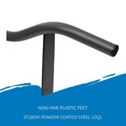 - Sturdy, gray powder-coated 1” wide tubular legs with protective feet fold into recessed channels for compact storage