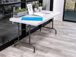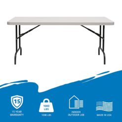 Each table’s top is made of dent and scratch-resistant, blow-molded, high-density polyethylene atop a steel frame that can hold from 500 to 1,000 pounds of evenly distributed weight depending on the table –that’s a lot of potato salad! When your work or play is done, the legs fold into recessed channels for storage. You’ll be the hero of every gathering, saving the day for barbecues, and get-togethers.