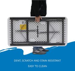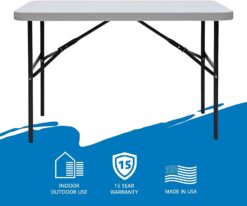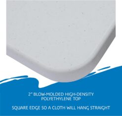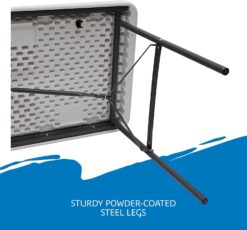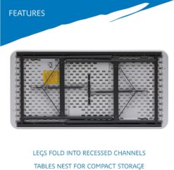 Each table’s top is made of dent and scratch-resistant, blow-molded, high-density polyethylene atop a steel frame that can hold from 500 to 1,000 pounds of evenly distributed weight depending on the table –that’s a lot of potato salad! When your work or play is done, the legs fold into recessed channels for storage. You’ll be the hero of every gathering, saving the day for barbecues, and get-togethers.