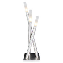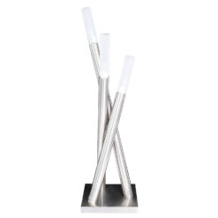 Cylindrical frosted sconces create a soft glow, accenting the modern design of the tubular brushed metal nickel arms on the Icicle Lamp. If you prefer a subtle contemporary look, this lamp is the perfect choice. Uses 40-watt G9 halogen bulbs.
