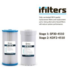 - Two stages with a 30-micron, washable, pleated sediment filter and GAC KDF for chlorine, iron, heavy metals, odor and more