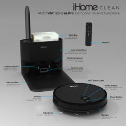 iHome AutoVac Eclipse Pro Robot Vacuum with Auto Empty Base and Mapping Technology, 2200pa Ultra Strong Suction Power, 120 Minute Runtime, Holds Weeks of Debris, App Connectivity
