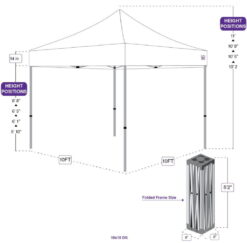 - SPECIFICATIONS: Canopy measures 10 feet x 10 feet. Stands at approximately 11 feet high at the tallest height position