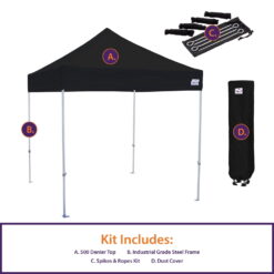 - INCLUDES: 10 x 10 textured commercial grade steel frame, canopy top, roller bag, pinch-proof sliders and locks, and rope/spike kit.