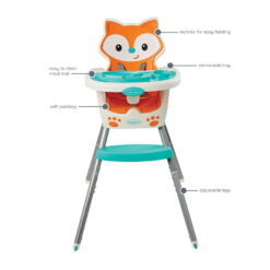 This 4-in-1 high chair transforms into a space saver, booster and toddler chair. Features a dishwasher safe multi-functional meal mat and easy release removable food tray. Food tray and seat back are adjustable for ideal positioning from tiny to toddler. Cushioned, low-density foam padding is soft for baby, and easy to clean for parents.