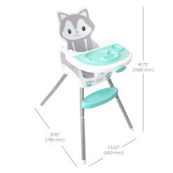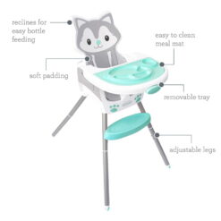 This fun, versatile high chair transforms into a 2-stage booster and toddler chair. The adjustable seat back and tray table ensure ideal positioning from tiny to toddler. Meal time is more exciting with a dishwasher-safe, multifunctional divided meal mat that encourages little ones to explore flavors and textures. An easy-to-release removable tray table makes getting baby in and out simple and convenient. A cushioned, low-density foam padding provides a soft place for your little one to sit comfortably. This high chair is smartly designed and will transform 4-ways to accommodate your little one from tiny to toddler. First, our adjustable recline mode allows you to use this high chair for bottle feeding, lightening the load of carrying your baby and making feedings less messy. Next, when your baby starts eating solids, transition to the upright high chair position or our infant booster mode with the tray table and meal mat atop, giving your baby the perfect place to explore new flavors and textures. Then, when your growing baby is ready to join you at the dining table, slide the attached booster near the dining table and remove the tray table; you could use the meal mat in this mode or any other baby-safe plate you prefer. Lastly, attach the included shorter legs to the booster to create a unique toddler chair that’s great for reading books or taking a load off between playtime. With all these valuable modes, this high chair will be the only high chair you and your baby will need. Plus, it is easy to wipe clean and adorably cute, too!