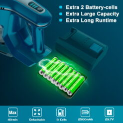 - 2500mAh Detachable Large Capacity Battery – 8-Cell Lithium-Ion batteries inside supporting the vacuum cleaner with a longer runtime, up to 45 mins on standard mode, 20 mins on max mode. The removable battery pack can be charged in or out of the vacuum
