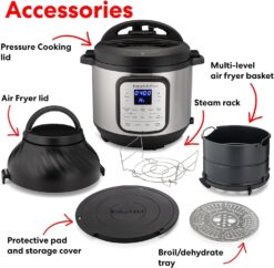 - QUICK ONE-TOUCH COOKING: 11 customizable Smart Programs for air frying, pressure cooking ribs, soups, beans, rice, poultry, yogurt, desserts and more. Includes free app with over 1900 recipes!