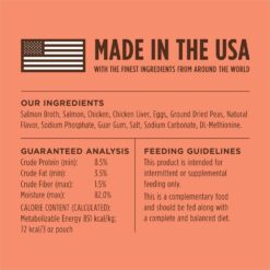 Salmon Broth, Salmon, Chicken, Chicken Liver, Eggs, Ground Dried Peas, Natural Flavor, Sodium Phosphate, Guar Gum, Salt, Sodium Carbonate, DL-Methionine.