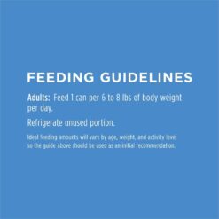 | Directions | Ideal feeding amounts will vary by age, weight and activity level. Feed at room temperature and refrigerate unused portion. Always provide access to clean, fresh water. Adults: Feed 1 can per 6 to 8 lbs of body weight per day. |
