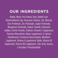 Rabbit, Water, Pea Protein, Peas, Rabbit Liver, Montmorillonite Clay, Potassium Chloride, Salt, Minerals (Iron Proteinate, Zinc Proteinate, Copper Proteinate, Manganese Proteinate, Sodium Selenite, Potassium Iodide), Choline Chloride, Vitamins (Vitamin E Supplement, Thiamine Mononitrate, Niacin Supplement, D-Calcium Pantothenate, Pyridoxine Hydrochloride, Riboflavin Supplement, Vitamin A Supplement, Biotin, Vitamin D3 Supplement, Vitamin B12 Supplement, Folic Acid), Taurine, L-Ascorbyl-2-Polyphosphate.