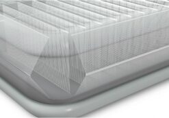 The Comfort Plush Elevated Airbed is a part of the Dura-Beam series of airbeds that are providing amazing durability for years of lasting comfort. The secret is in the Fiber-Tech beam construction, which is comprised of thousands of high-strength polyester fibers that provide enhanced comfort, stability and support. Each bed is covered in plush flocking that is soft to the touch, and the horizontal air chambers provide added stability and support around the entire bed. The mattress is also equipped with a quality-tested, 20.8-gauge waterproof flocked top with 15-gauge vinyl beams and 16-gauge sides and bottom for durability. And best of all, the Comfort Plush mattress is remarkably easy to inflate thanks to the built-in, high-powered electric pump, which does its job in a mere 3-1/2 minutes. No more fussing with tiring hand or foot pumps or rummaging through the garage for your detached electric pump. And should the mattress feel a little too soft or firm, you can customize the comfort level with the touch of a button. The Comfort Plush is raised 22 inches from the floor, making it far taller than most inflatable mattresses. And at 60 by 22 by 80 inches (W x H x L), the mattress is an official queen size, making it a good fit for fitted sheets. The Comfort Plush Queen bed–which offers a capacity of 600 pounds–is a terrific choice whether you’re sleeping at the in-law’s overcrowded house or setting up a guest bed in the basement. The mattress comes with an AC power cord and a duffel bag (for storage). Regarding Inflation: Measurements will vary based on the manner in which it is inflated and packaging disclaims “approximate size”. Airbeds are measured from the widest point including the beams (bulges) on the side and off the tallest point from the floor including built-in pillows if applicable. Location, temperature, and humidity will affect the airbed’s firmness. Airbeds will need to be occasionally re-inflated (topped off) to maintain desired firmness when used for more than a few days as vinyl tends to relax over time.
