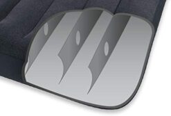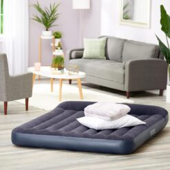 For those who need a pillow but lack the space to carry one, this luxurious flocked bed is the answer. This airbed is a perfect combination of luxurious quality and convenience! The built-in pillow is designed to provide support and comfort and the fast and easy built-in electric pump inflates and deflates with the touch of a button, easily adjusting to your desired level of firmness. The mattress is also equipped with waterproof flocked sleeping surface and sides to provide long lasting comfort. Its lightweight vinyl construction makes it durable yet easy to pack up and transport with the included carry bag. The stain resistant surface makes it easy to keep clean while providing the soft comfort of home. Regarding Inflation: Measurements will vary based on the manner in which it is inflated and packaging disclaims “approximate size”. Airbeds are measured from the widest point including the beams (bulges) on the side and off the tallest point from the floor including built-in pillows if applicable. Location, temperature, and humidity will affect the airbed’s firmness. Airbeds will need to be occasionally re-inflated (topped off) to maintain desired firmness when used for more than a few days as vinyl tends to relax over time.
