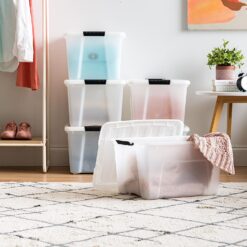 - STACK THEM UP – The Large Plastic Storage Container Bin Tote has grooves on the lid and body to create a secure stacking experience. IRIS USA lid-body construction ensures stability to stack securely for easy moving, and save space in your house, apartment, and condo.