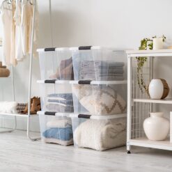 - STACK THEM UP – The large plastic storage container bin tote has grooves on the lid and body for secure and stable stacking that allows for easy moving and saves space in your house, apartment, or condo while the see-through design allows you to find any stored items easily from any angle.