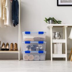 IRIS USA 60 Quart WEATHERPRO Plastic Storage Box with Durable Lid and Seal and Secure Latching, Clear With Blue Buckles, Weathertight, 3 Pack