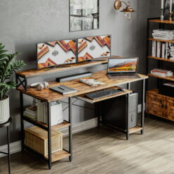 This home office computer desk features a monitor stand shelf to add another sizable level to your desk and frees up tons of workspace below. The raised desktop can elevate the monitor to the needed viewing height, improving your posture and raising your screen to perfect eye level to relieve your neck pain in some way. Add industrial style to your home office or study space with this space-saving practical brown computer desk table. Featuring P2 grade MDF board and metal frame, 55″ Length desktop offers ample storage and workspace. Highly functional with a large workspace. place it in your home office with the confidence that you made the right choice.