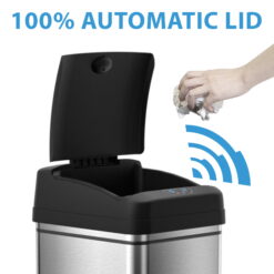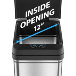 iTouchless 13 Gallon Stainless Steel Sensor Trash Can is the perfect kitchen trash can. Simply place your hand into the sensor zone and the lid will open automatically – no touching needed! Trash odors are absorbed and neutralized by the Natural Carbon Odor Filter system. Your first activated carbon odor filter is included free! It’s also equipped with VisioSense LED alert and Reflx technology to prevent the lid closing on your hand. Key features include: stainless steel fingerprint-proof body, a durable ABS plastic lid, an advanced next-gen infrared touchless sensor, natural carbon odor filter deodorization technology, retainer ring technology and a one year manufacturer’s warranty Product Dimensions: 12.75” D x 10.75” W x 27.88” H (35.75″H with lid open)