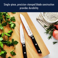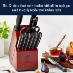 Equip your kitchen for less with this essential knife set. Since 1895, Henckels International has been making high quality, everyday knives at an exceptional value. The Henckels International solution knife set is stocked with tools to tackle every kitchen task. The handsome hardwood block handily keeps this useful knife collection within reach on your countertop. Fabricated from high-quality stainless steel, the single-piece, precision-stamped knife blades are lightweight without sacrificing strength and durability. Along with the ergonomic, traditional triple-riveted handle, enjoy maximum maneuverability and fatigue-free cutting. Honed for long-lasting sharpness, the Fine-Edge blades boast precision cutting. Curved for comfort, the break-proof, triple-riveted handles are pleasant to grip, giving you the control you need to slice through tougher cuts with ease.