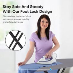 - 【Steel Mesh Top Ironing Board】13″x43″ mesh top surface iron area, while the non-skid feet can protect your tile or wood flooring. 7 different height adjusted levels, also as a lock to prevent ironing board collapsing accidentally, ironing table can be raised up from 29″ to 35″, you can sit on sofa for ironing.