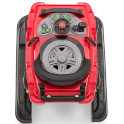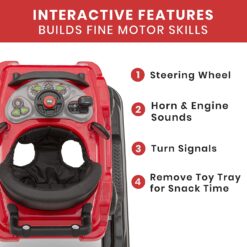 - Toy tray features steering wheel that turns left to right and makes realistic horn and engine sounds, turn signals light up, remove the toy tray to reveal a snack tray