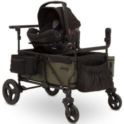 The Jeep Deluxe Wrangler Stroller Wagon with Cooler Bag and Parent Organizer by Delta Children is ready to tackle any family adventure. Designed with all the conveniences of a double stroller and the rugged durability of a wagon, it’s a super-fun crossover that makes any outing easy—take it to the park, beach or sporting event. With so many ways to ride, it’s ideal for kids of varying ages. Attach your current infant car seat with the included adapter for babies or use the two seats with 5-point safety harnesses to securely transport older siblings, twins or friends. The UV blocking canopy protects little ones from the sun while pull-down shades block additional light during naptime. Remove the canopy for open-air cruising. Equipped with more storage than the average stroller, this wagon comes with a removable cooler bag, parent organizer, cup holder and multiple storage pockets to keep all your must-have travel gear on-hand.