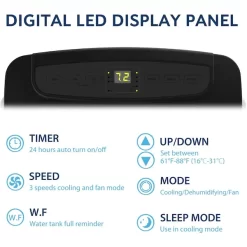 - Programmable Timer and Sleep Mode: Integrated 24-hour timer can be set using electronic controls on the LED display screen; Sleep mode goes one step further by slowly adjusting the temperature and fan speed to keep you comfortable overnight