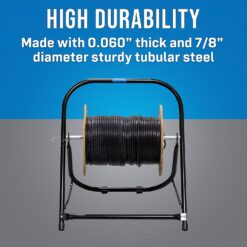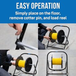 - EASY OPERATION: Easy to set up by just placing Cable Caddy on floor, removing cotter pin, and loading reel. Able to firmly hold cable reels weighing up to 100 lb and measuring up to 20” diameter and 17” height
