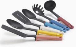- Set includes solid spoon, slotted spoon, slotted turner, flexible turner, spaghetti claw and ladle