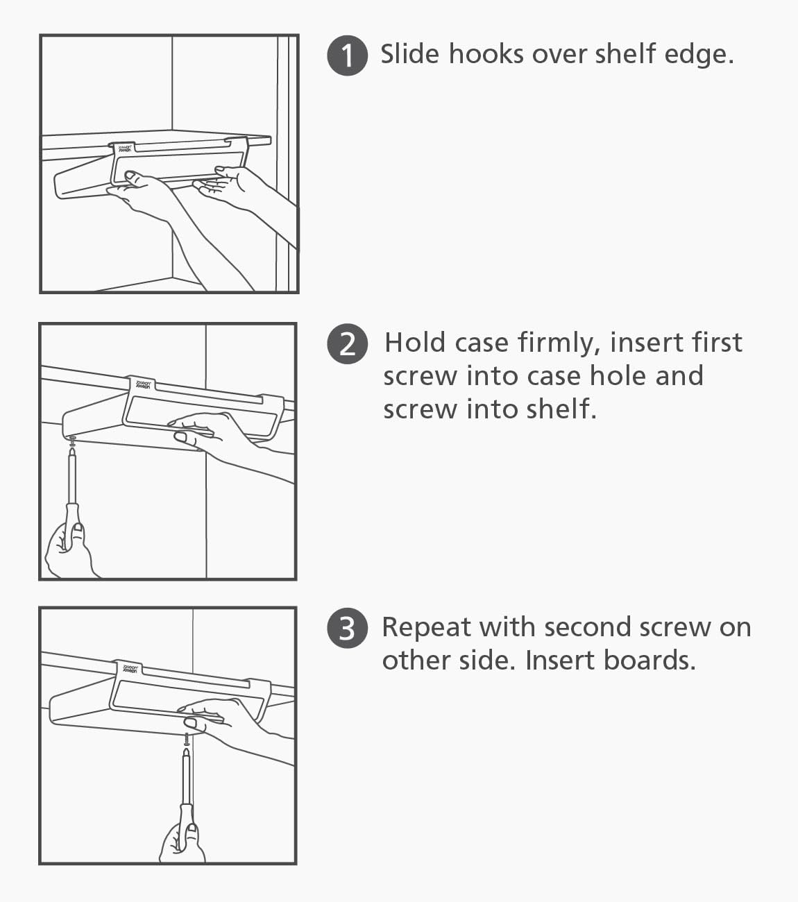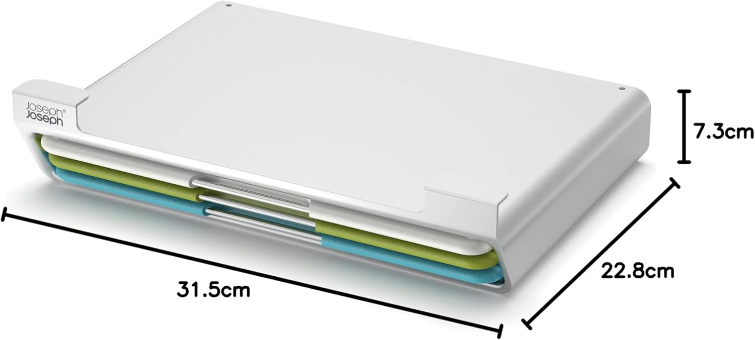 This innovative chopping board set makes great use of wasted space beneath the shelf, thereby maximising every inch of cupboard area. The set includes three color-coded chopping boards with knife-friendly, textured cutting surfaces on both sides, stainless-steel selecting bars and non-slip feet. These are held inside a slimline storage case that hooks onto your existing shelf and is secured at the back with two small screws (included). The case can be mounted either inside the cupboard or beneath and has a tiered design making the boards easy to select. Dimensions: H7.3 x W31.5 x D22.8 cm (H2.8 x W12.4 x D8.9 inches). Maximum shelf thickness 2 cm (0.75 inches). Suitable for kitchen units with a minimum internal size of: W33 x D24 cm (13 x 9.5 inches). Boards – dishwasher safe; Case – wipe clean with a damp cloth.