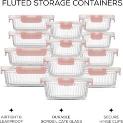 JoyJolt 24pc Fluted Glass Storage Containers with Lids. 12 Airtight, Freezer Safe Food Storage Containers, Pantry Kitchen Storage Containers, Glass Meal Prep Containers for Lunch, Pink