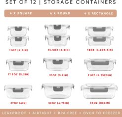 - 12 Airtight Food Storage Containers With Lids: Includes Four Rectangle Containers 35oz (8x6in), 21oz (6.75x5in), 12oz (two 4.2×5.5in). 4 Square Containers 27oz (6in), 17.5oz (5.2in), 11oz (two 4.3in). 4 Round Containers 32oz (6.75in). 21oz (5.9in), 13.5oz (two 5.2in). Height ranges from 1.75-2.3 inches.