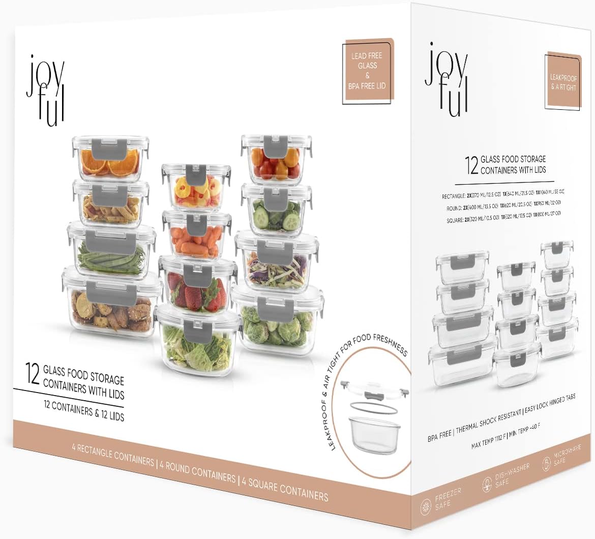 - Glass Food Storage Containers for Everything! Aside from the obvious fact that JoyFul by JoyJolt glass meal prep containers are healthier for you and your food, you can also go from freezer to oven without breaking, with a variety of shapes and sizes to fit your purpose. What a JoyFul Idea!
