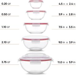 - 5pc Glass Mixing Bowls With Lids Set: The big bowl is 11in wide and 5.9in tall, while the 2qt bowl is 9×3.9in. Two med / small glass bowls include 7.5×3.5in, 5.9×2.8in and finally the small glass bowl is 4.5×2.4in. Each one nests into the other with the lids on, so nothing gets lost in your cupboard.
