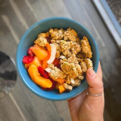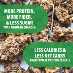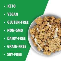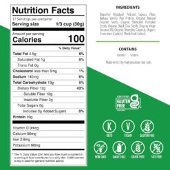 Digestive resistant prebiotic tapioca fiber, Natural Vanilla Pea Protein, Organic natural sesame seeds, Organic shineskin pumpkin seeds, Organic black chia seeds, Organic virgin coconut oil, Organic shredded coconut, Organic cinnamon (ceylon), Monk Fruit Extract