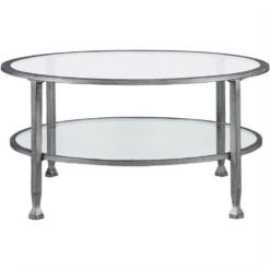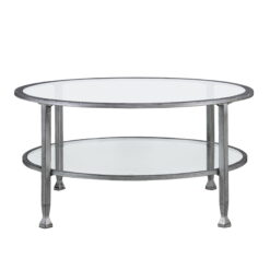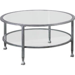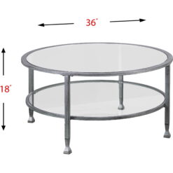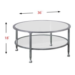 Round out your decor with this metal and glass cocktail table. The simple circular shape holds tempered glass tabletop and shelf, crafting a slight shadowbox effect; open architecture easily displays tchotchkes or basket storage. Instill contemporary elegance in your space with this small space-friendly round coffee table in the living room, family room, or den.