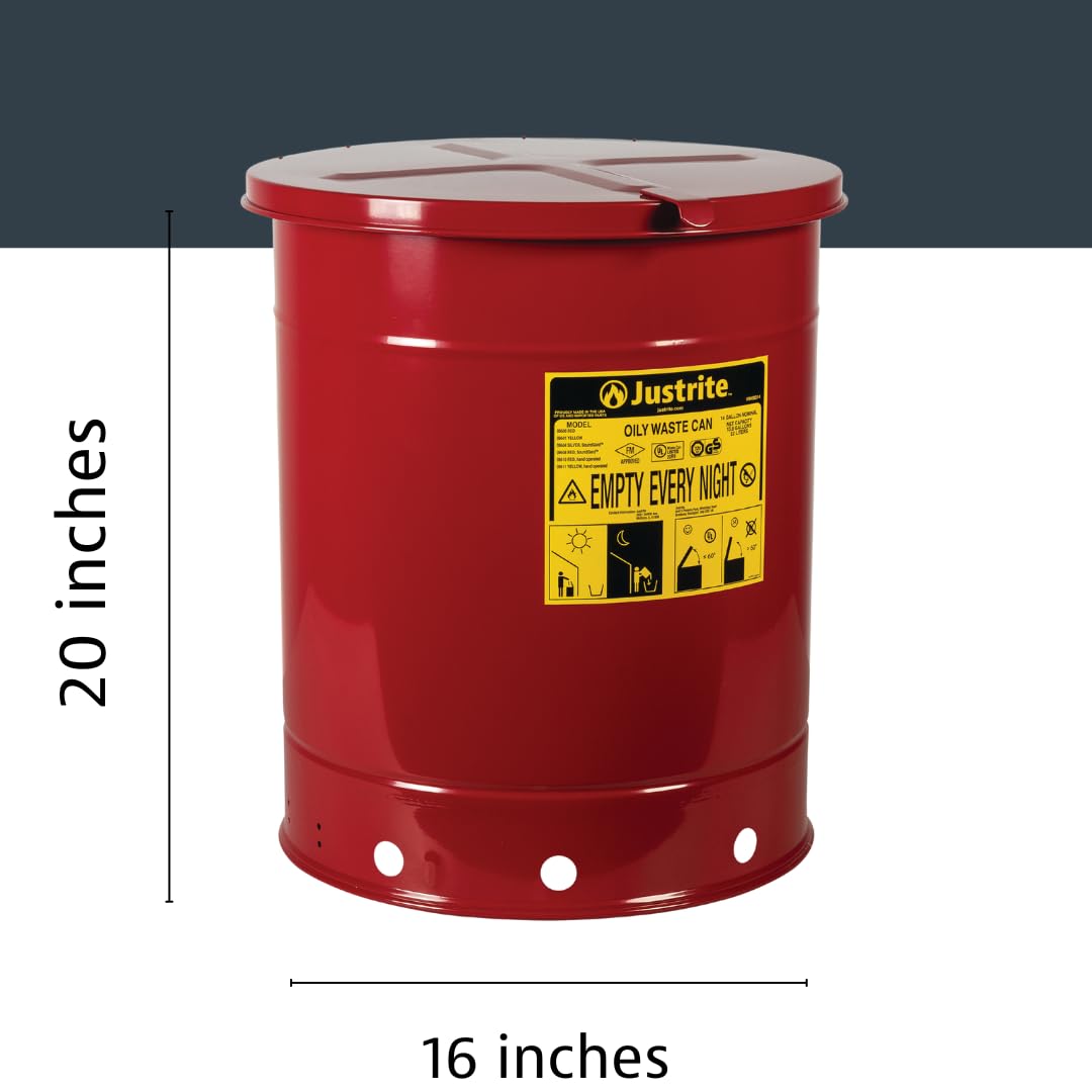 Justrite 14 Gallon Galvanized Steel Oily Waste Can, 20″ x 16″ Metal Oil Rag Safety Can with Hand Operated Self-Closing Lid for Oil Rag Disposal, Made in The USA, Red, 09510